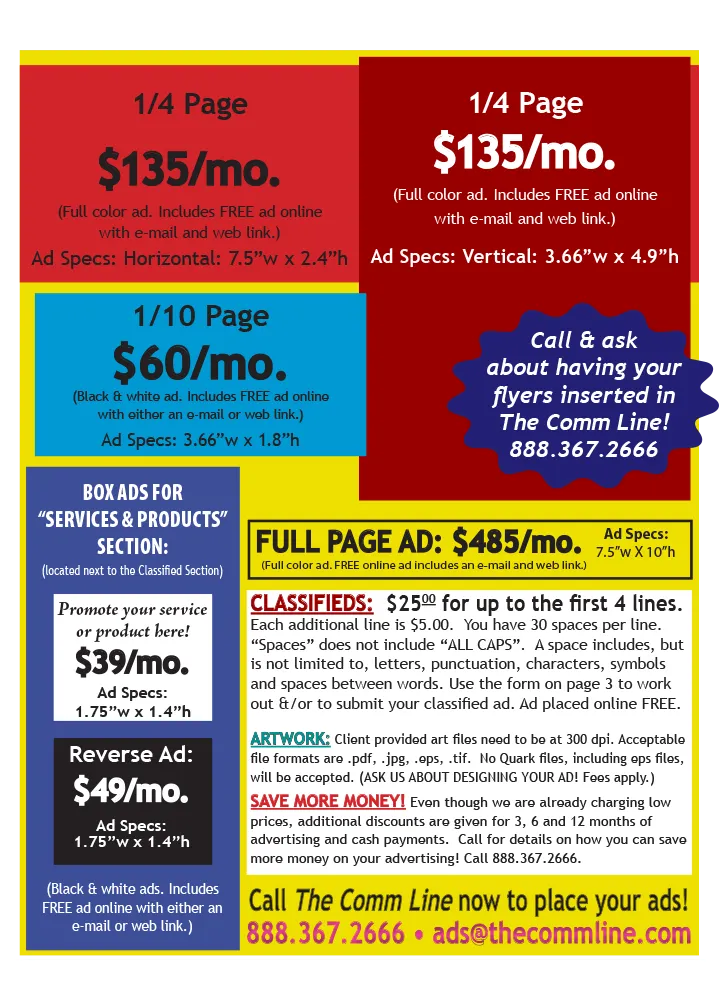 This will describe the fees and features when you advertise with the all-new Comm Line